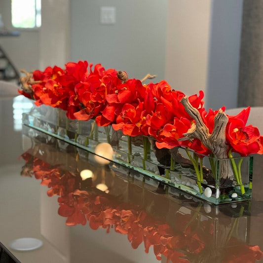 Moderner Glas-Pflanzkübel „Modern Home“ 122 cm mit roten Cymbidien