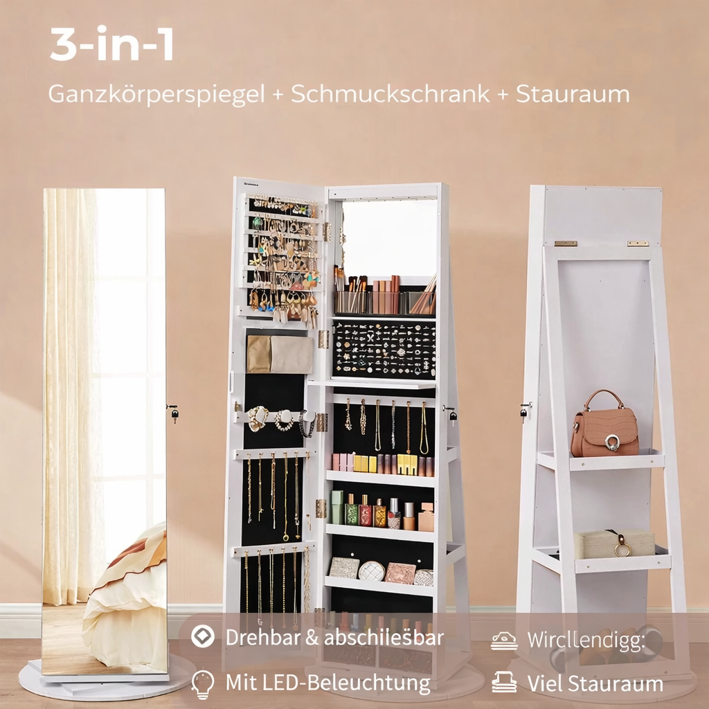 Dieser Standspiegel mit integrierter Schmuck- und Kosmetikaufbewahrung bietet eine praktische Lösung zur übersichtlichen Organisation Ihrer Accessoires.